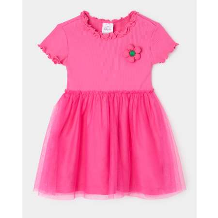 Ярко-розовое платье для девочки BabyGo с пышной юбкой. Декорировано оборками на вороте и объёмным цветочком.