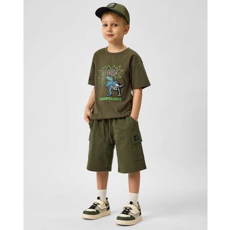 Однотонные шорты для мальчика Futurino в цвете хаки, с накладными карманами. Декорированы нашивкой.