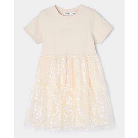 Бежевое платье для девочки Futurino с надписью "Lovely" и пышной юбочкой, декорированной блестящим леопардовым принтом.