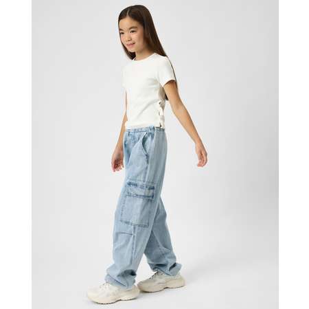 Широкие джинсы-джоггеры для девочки Futurino голубого цвета, с накладными карманами.