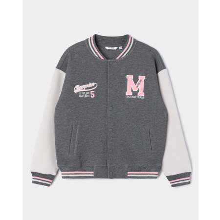 Стильный бомбер для девочки Futurino в тёмно-сером цвете, с контрастными рукавами и надписями.