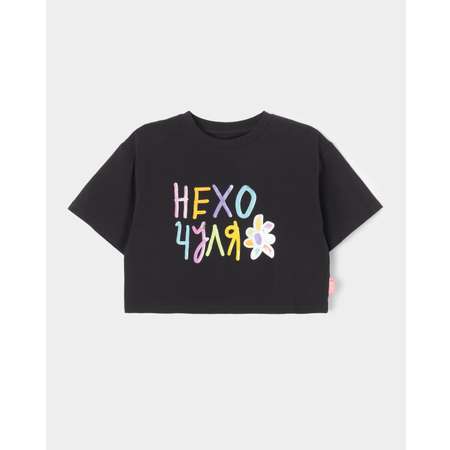 Чёрная укороченная футболка для девочки Futurino Fashion с цветным принтом "Нехочуля".