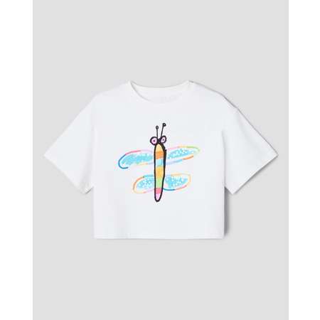 Укороченная белая футболка для девочки Futurino Fashion с двухсторонним цветным принтом, декорированная пайетками.