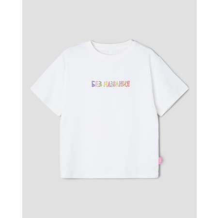 Белая футболка для девочки Futurino Fashion, декорированная двухсторонним принтом с цветными надписями.