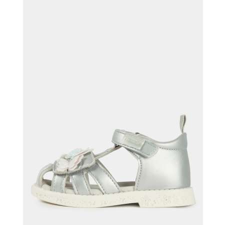 Закрытые серебристые сандалии для девочки Tombi с объёмным декором в виде блестящих бабочек.