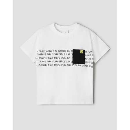 Белая футболка для мальчика BabyGo, декорированная контрастным принтом с надписями и нашивкой на нагрудном кармане.