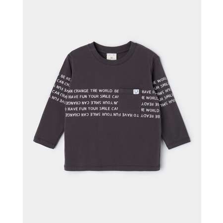 Тёмно-серый лонгслив для мальчика BabyGо, декорированный контрастным принтом с надписями и нашивкой на нагрудном кармане.