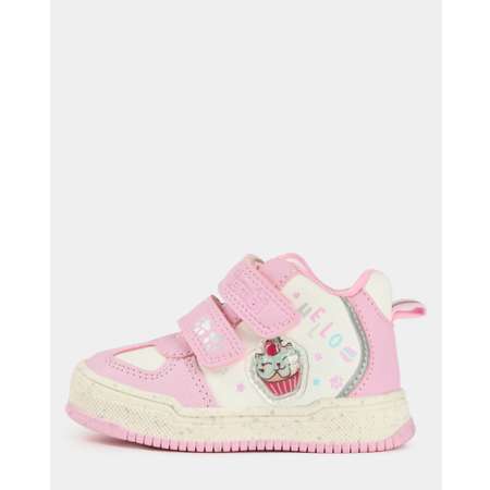 Бело-розовые ботинки для девочки Tombi, декорированные цветными нашивками.