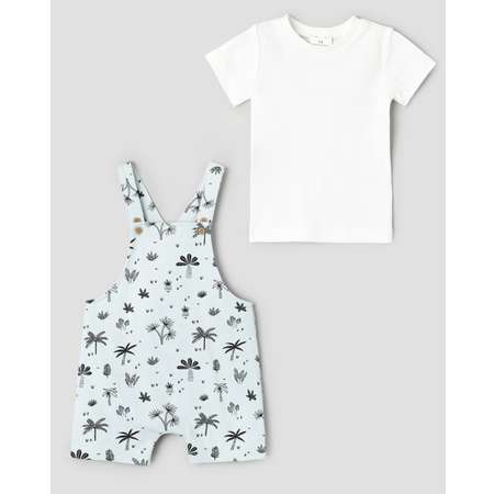 Летний комплект для мальчика BabyGo из белой футболки и голубого полукомбинезона с принтом "пальмы".