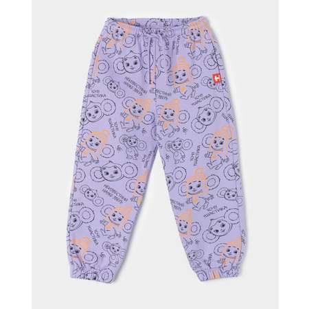 Сиреневые брюки для девочки, декорированные принтом с весёлым Чебурашкой.