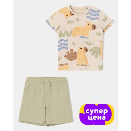Летний комплект для мальчика BabyGo из однотонных шорт в цвете хаки и серой футболки, декорированной принтом с капибарами.