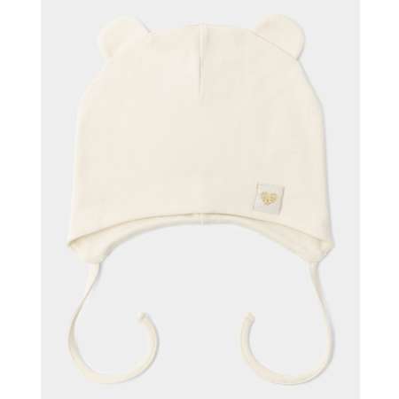 Шапка на завязках для девочки BabyGo молочного цвета, с ушками. Декорирована нашивкой.