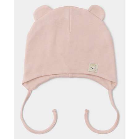 Шапка на завязках для девочки BabyGo розового цвета, с ушками. Декорирована нашивкой.