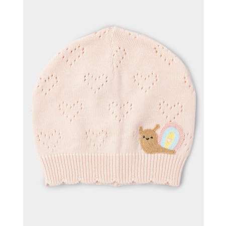 Светло-розовая шапка для девочки BabyGо со сквозным узором и объёмной нашивкой в виде забавной улитки.