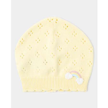 Жёлтая шапка для девочки BabyGо со сквозным узором и объёмной нашивкой в виде радуги.