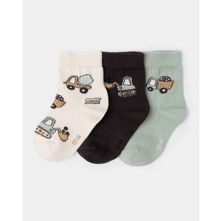 В комплекте BabyGо три пары носков для мальчика, декорированных цветным принтом - молочные, тёмно-серые и зелёные.