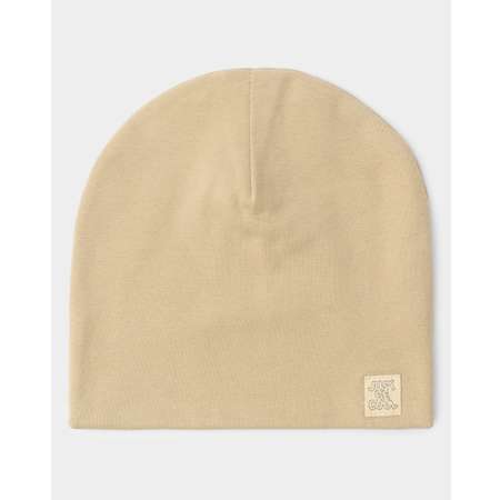 Бежевая шапка для мальчика BabyGo, декорированная нашивкой.