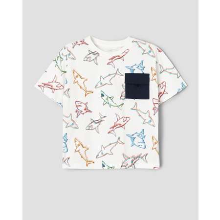 Белая футболка для мальчика Futurino, декорированная принтом с акулами. Дополнена контрастным нагрудным карманом.