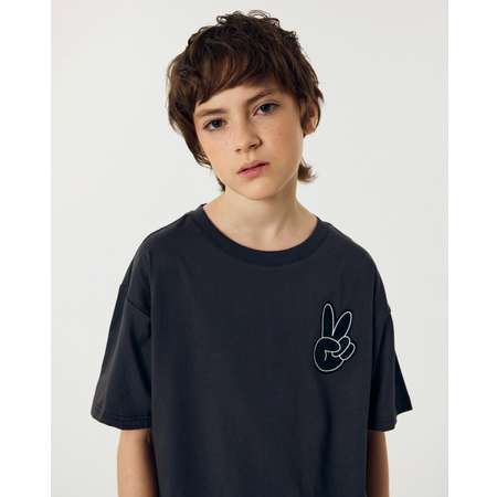 Тёмно-серая футболка для мальчика Futurino, декорированная двухсторонним принтом в виде цветных нашивок.