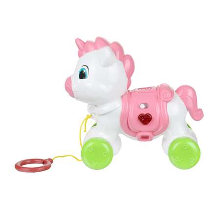 Вашего ребёнка приведёт в восторг эта игрушка в виде милого единорога со световыми эффектами. Управление игрушкой осуществляется с помощью одной кнопки в виде сердечка, которая светится в процессе работы. Маленький непоседа с удовольствием будет нажимать на эту кнопку и слушать весёлые песенки из любимых мультфильмов и волшебную сказку про дружбу, а также заниматься весёлой зарядкой. Кроме того, игрушка оснащена подвижными колёсиками и верёвочкой - с ней можно играть как с каталкой.