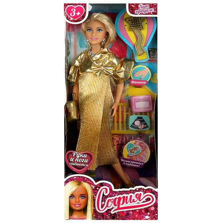 Будущая мама София одета в нарядное золотое платье. Образ куколки дополняют модные крупные серьги, колье и элегантная сумочка. Одежду и аксессуары легко снять и надеть. С такой модной куклой девочке будет интересно и весело играть: благодаря тому, что руки и ноги куклы подвижны, им можно придать любое положение. У Софии длинные красивые волосы, которые хозяйка куклы сможет заплетать в разные причёски. Детально проработанный дизайн игрушки вдохновит девочку на новые игровые сюжеты.