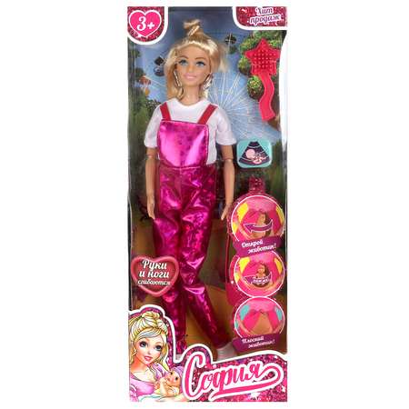 Модная мама София одета в блестящий розовый комбинезон и белую футболку. Образ куколки дополняют элегантные серьги. Одежду и аксессуары легко снять и надеть. С такой модной куклой девочке будет интересно и весело играть: благодаря тому, что руки и ноги куклы подвижны, им можно придать любое положение. У Софии длинные красивые волосы, которые хозяйка куклы сможет заплетать в разные причёски. Детально проработанный дизайн игрушек вдохновит девочку на новые игровые сюжеты.