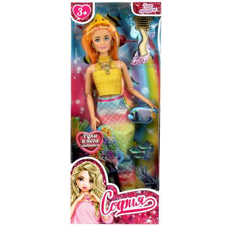 Прекрасная русалка София одета в красивый жёлтый топ, а также золотистые серьги, колье и корону. Её разноцветный хвост из красиво блестит и переливается. Одежду легко снять и надеть. С такой модной куклой девочке будет интересно и весело играть: благодаря тому, что руки и ноги куклы подвижны, им можно придать любое положение. У Софии длинные красивые волосы, которые хозяйка куклы может заплетать в разные причёски. Детально проработанный дизайн игрушки вдохновит девочку на новые игровые сюжеты.