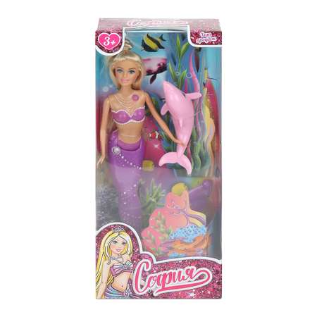 Прекрасная София одета в стильный сиреневый топ, как у настоящий русалки, у нее есть прекрасный сиреневый хвост. С такой куклой девочке будет интересно и весело играть. У Софии длинные красивые волосы, которые хозяйка куклы сможет заплетать в разные причёски. Детально проработанный дизайн игрушки вдохновит девочку на новые игровые сюжеты.