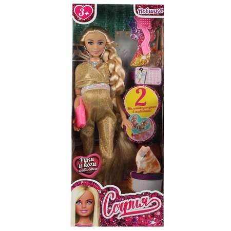 Будущая мама София одета в нарядный золотой комбинезон. Образ куколки дополняют модные крупные серьги, колье и элегантная сумочка. Одежду и аксессуары легко снять и надеть. С такой модной куклой девочке будет интересно и весело играть: благодаря тому, что руки и ноги куклы подвижны, им можно придать любое положение. У Софии длинные красивые волосы, которые хозяйка куклы сможет заплетать в разные причёски. Детально проработанный дизайн игрушки вдохновит девочку на новые игровые сюжеты.