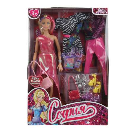 Модница София одета в блестящее платье розового цвета. Образ куколки дополняют стильные серьги и браслет. Одежду и аксессуары легко снять и надеть. С такой модной куклой девочке будет интересно и весело играть: благодаря тому, что руки и ноги куклы подвижны, им можно придать любое положение. У Софии длинные красивые волосы, которые хозяйка куклы сможет заплетать в разные причёски. Наличие дополнительных аксессуаров в наборе сделает игры с куклой более разнообразными и интересными.