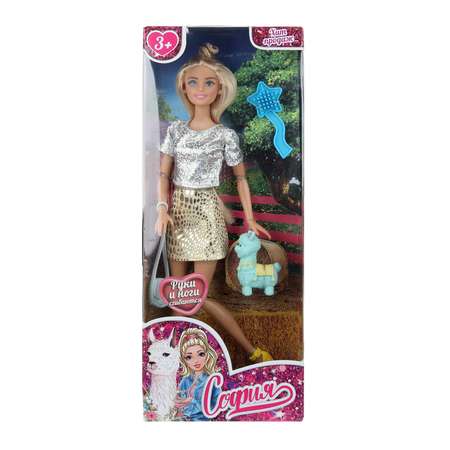 Модница София одета в блестящую серебристую футболку и юбку золотистого цвета с анималистичным принтом, на ногах жёлтые туфли на высоком каблуке. Одежду и обувь легко снять и надеть. С такой модной куклой девочке будет интересно и весело играть: благодаря тому, что руки и ноги куклы подвижны, им можно придать любое положение. У Софии длинные красивые волосы, которые хозяйка куклы сможет заплетать в разные причёски. Наличие дополнительных аксессуаров в наборе сделает игры с куклой более разнообразными и увлекательными.