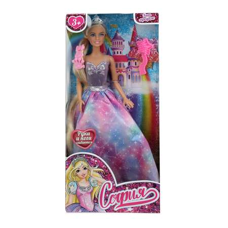 Прекрасная принцесса София одета в красивое платье с блестящим лифом и разноцветной юбкой с принтом-созвездиям. Образ дополняют серебристая корона и розовые заколки. Одежду и аксессуары легко снять и надеть. С такой модной куклой девочке будет интересно и весело играть: благодаря тому, что руки и ноги куклы подвижны, им можно придать любое положение. У Софии длинные красивые волосы, которая хозяйка куклы сможет собирать в разные причёски. Детально проработанный дизайн игрушки вдохновит девочку на новые игровые сюжеты.